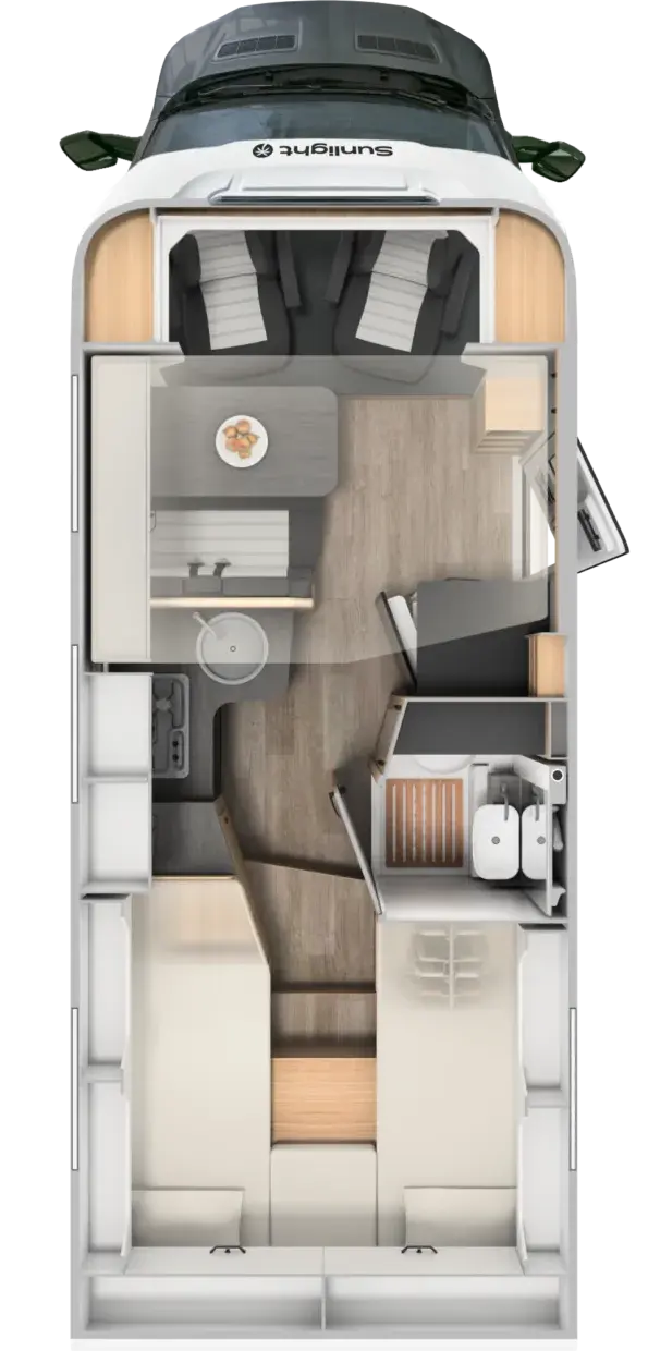 Einen hohen Komfort und viel Platz für die Familie bietet unser Teilintigrierter Ford. Der Sunlight ist neben einer Kochzeile mit einer kleinen Nasszelle ausgestattet und eignet sich für bis zu vier Personen.